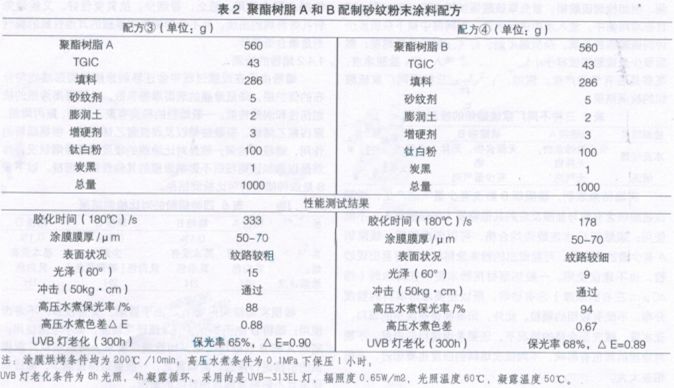 聚酯樹脂A和聚酯樹脂B配制聚酯平面粉末涂料配方見表1;聚酯樹脂A和聚酯樹脂B配制聚酯砂紋粉末涂料配方見表2。