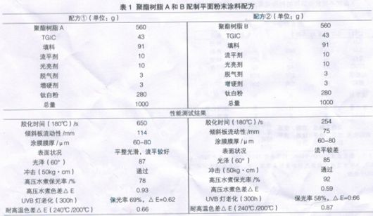 主要測試對比的性能有:粉末的膠化時(shí)間、粒度和熔融流動(dòng)性以及涂膜的外觀、機(jī)械性能、耐沸水性、耐高溫性和耐侯性等性能。